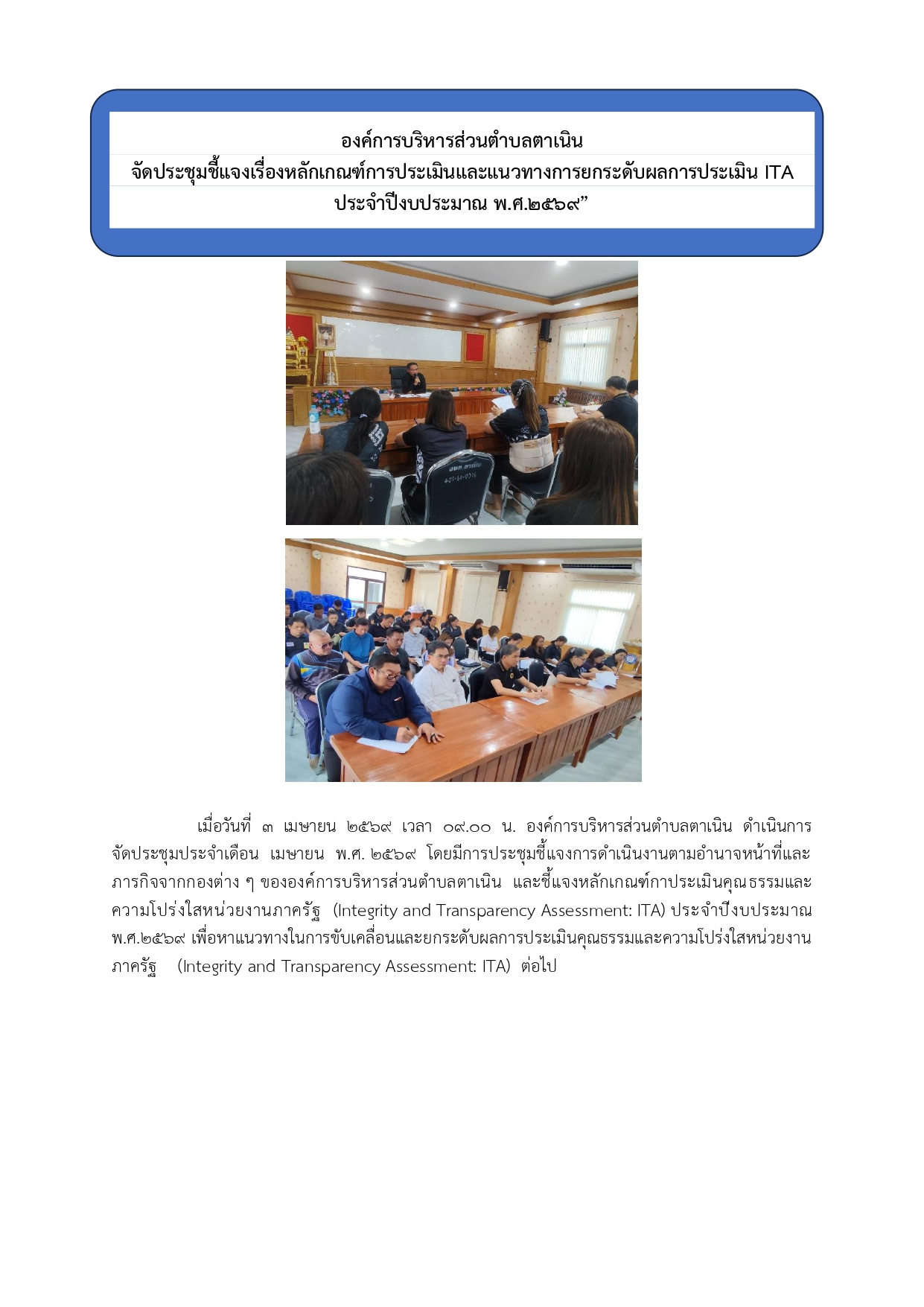 วันที่ 3 เมษายน 2569 เวลา 09.00 น.องค์การบริหารส่วนตำบลตาเนินได้จัดประชุมชี้แจ้งเรื่องหลักเกณฑ์การประเมินและแนวทางการยกระดับผลการประเมิน ITA ประจำปีงบประมาณ พ.ศ.2569